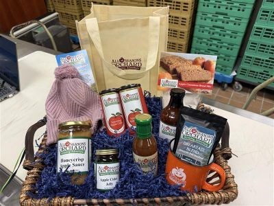 Donated by All Seasons Orchard in Woodstock, IL Includes the following: Hat Honey Crisp Apple Sauce Apple Cider Jelly Sparkling Apple Cider Apple Pie Syrup Breakfast Blend Coffee & Halloween Coffee Mug Honey BBQ Sauce Apple Cinnamon Bread Mix